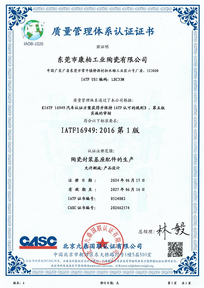 經(jīng)過一系列嚴(yán)苛的審核與評估程序,東莞市康柏工業(yè)陶瓷有限公司成功獲得國際汽車工作組(IATF)頒發(fā)的IATF 16949汽車認(rèn)證體系證書,標(biāo)志康柏工業(yè)陶瓷在汽車行業(yè)質(zhì)量管理體系方面達到了國際先進水平。
